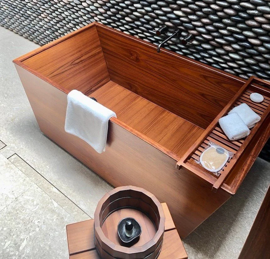 Our Ofuro design is based on the classic Japanese “Sukiya” architectural style. The shape lends itself to our signature contrast treatment in which two distinctive species of wood are incorporated into the design providing exciting creative opportunities.