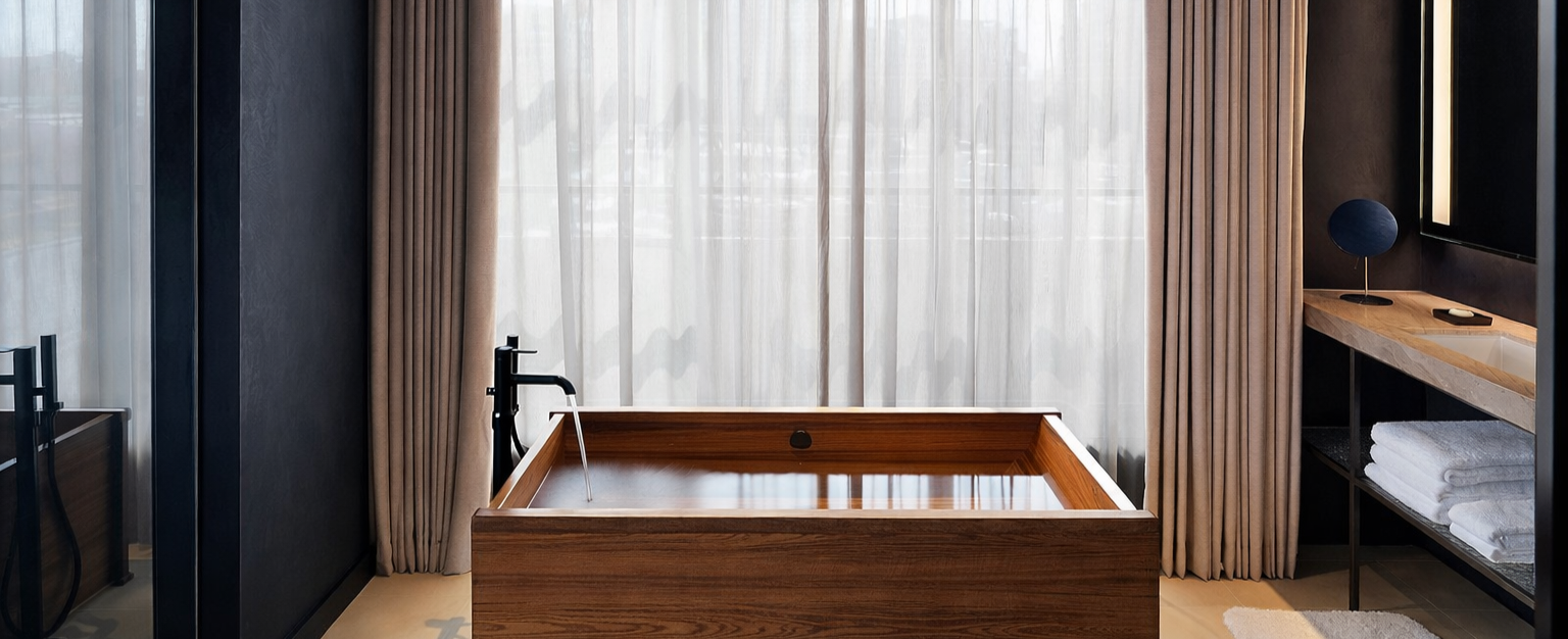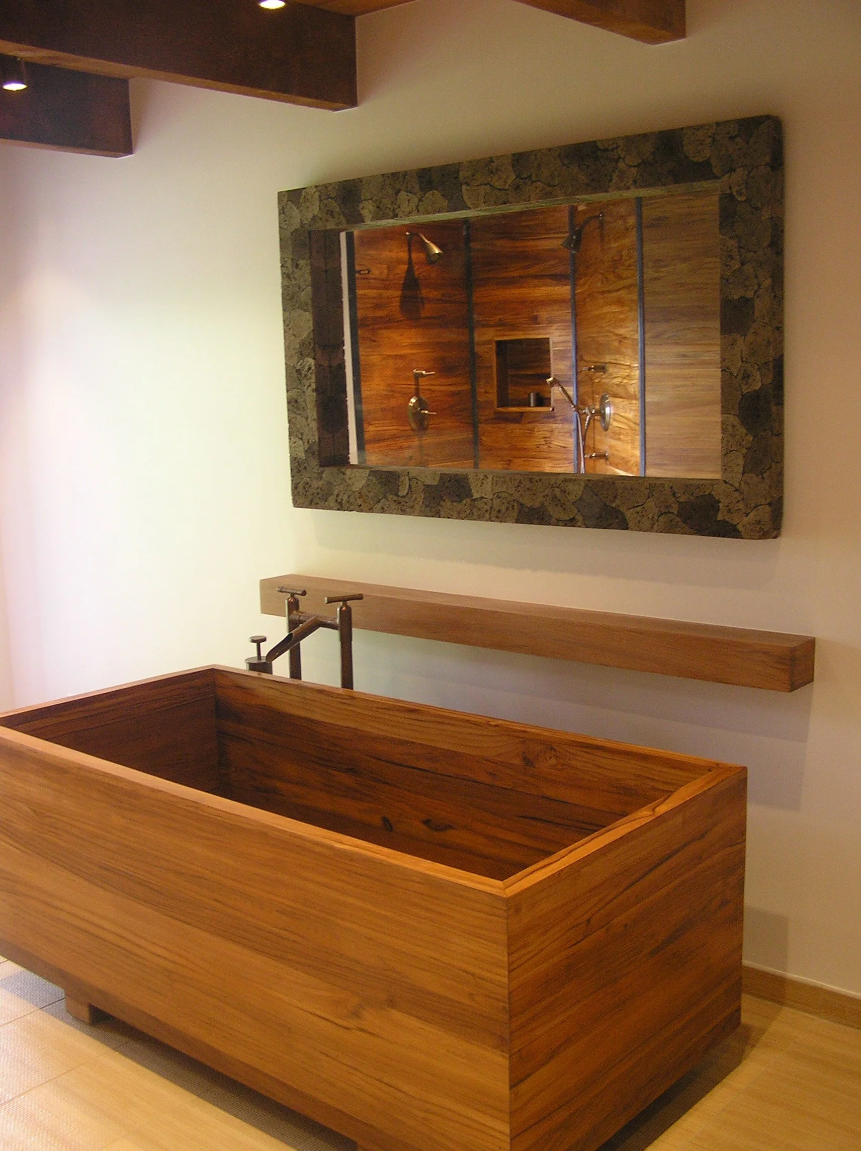 This double Ofuro, in Iroko, has contrasting Ebony plaques, a sophisticated design note. This tub is in a private suite in California.
