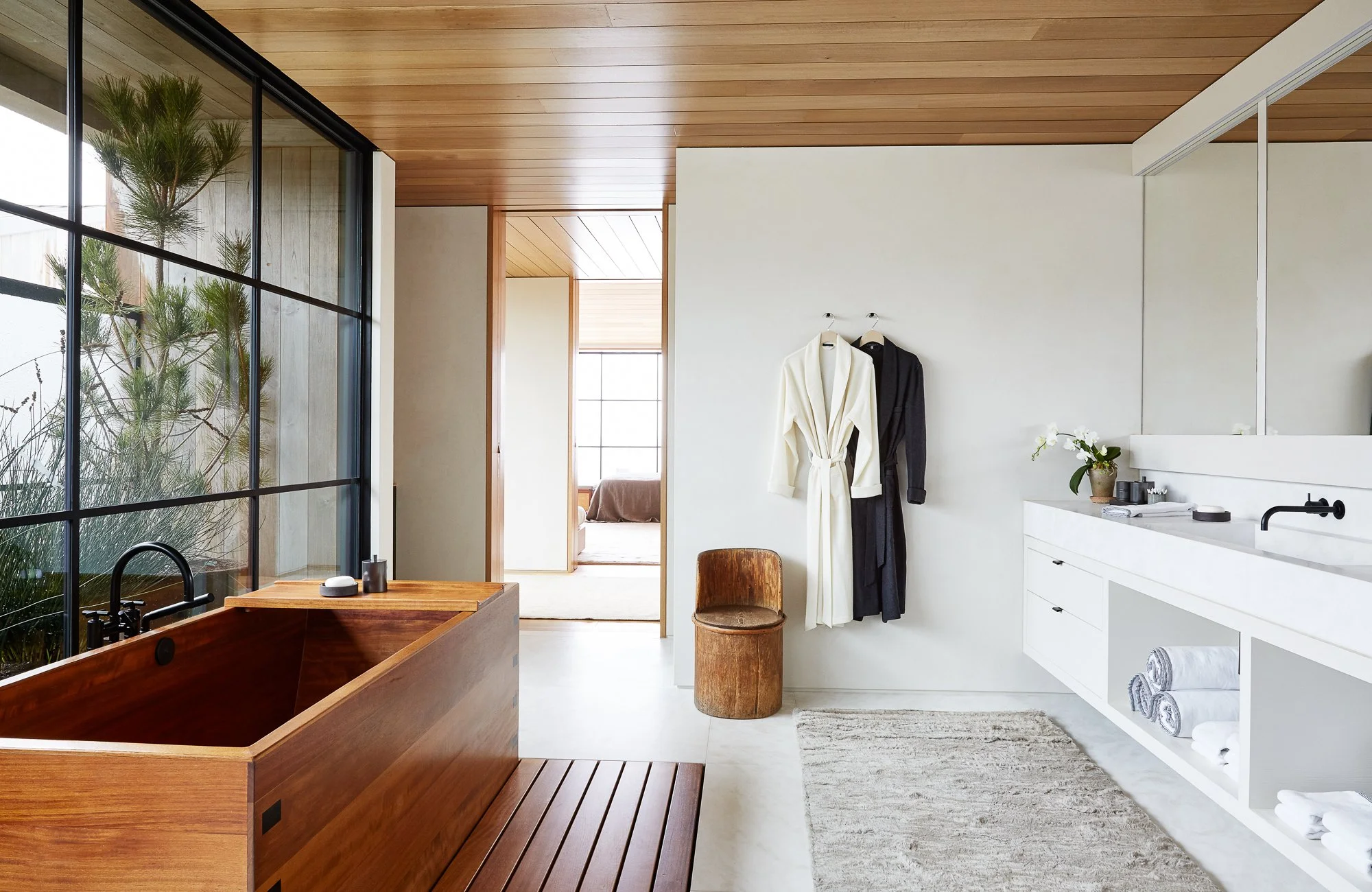 For a hilltop retreat on the island of Maui, we designed and crafted this Ofuro bathtub from Plantation Teak. Reflected in the mirror is the matching teak shower stall, along with a custom shelf unit—also built by our team. Every plank of wood used throughout the project, including a second tub for the guest suite, was carefully selected for tonal and grain harmony. Close collaboration with the interior design team ensured that each element integrated seamlessly into the overall vision for the home.