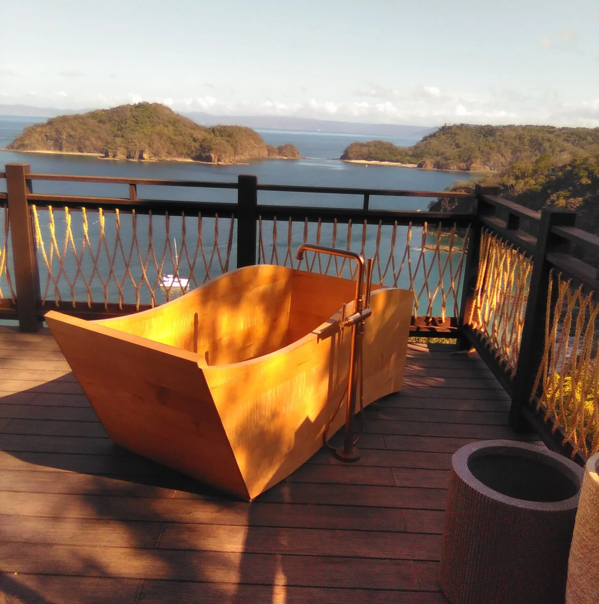 This custom curly maple tub was designed specifically for an elegant spa setting at the Ritz Carlton Reserve- Costa Rica. Its gently waved top edge echoes the surrounding coastline, lending the piece a calm, serene presence.